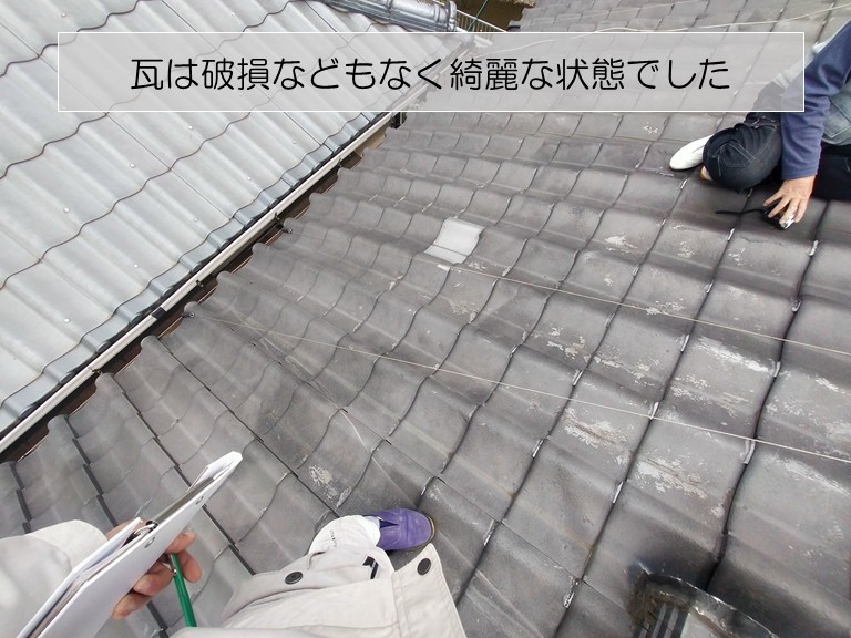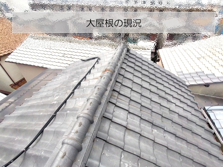 こちらが2階の大きな屋根(大屋根)の今の状態です。現場調査の際 瓦一枚一枚を確認しましたが、割れたりヒビが入ったりしている箇所はなく、表面はとても綺麗な状態を保たれていました。