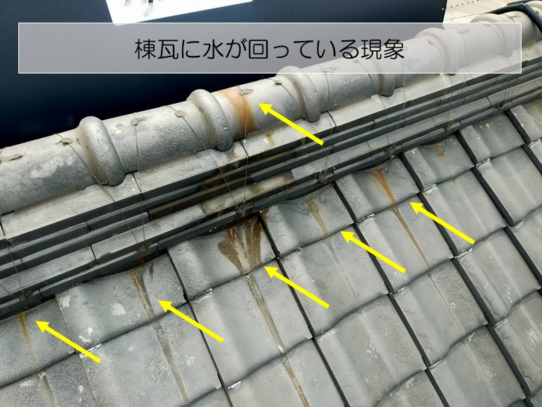 これは、本来なら屋根の外へ流れるはずの雨水☔が、棟瓦の内部に侵入して、内側からじわじわと漏れ出しているサインなんです☝