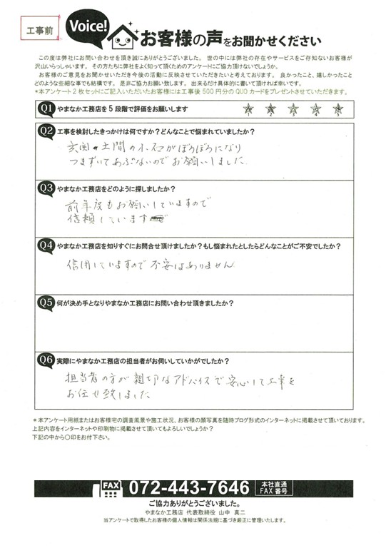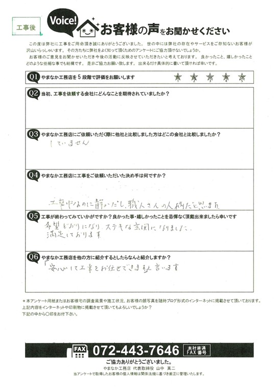 - 担当者の方が親切なアドバイスで安心して工事をお任せいたしました。