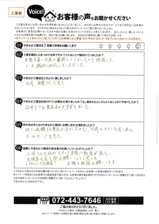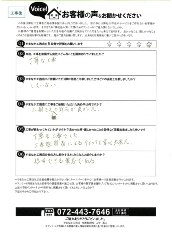 - 小南さんをはじめ、スタッフ全員の態度が良く、見積書(きちんとした見積書)を見て即お願いしようと思った。