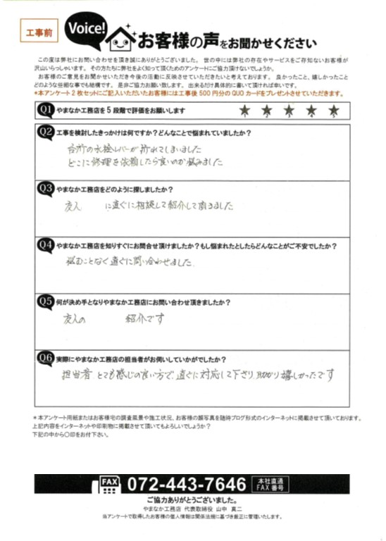 岸和田市でキッチンの水栓が劣化したため水栓入替工事をしたS様の声