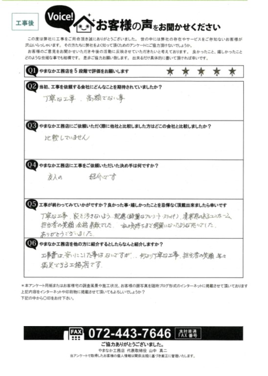 - 工事費は安いにこした事はないですが、何より丁寧な工事、担当者の笑顔、等々、満足できる工務店です。