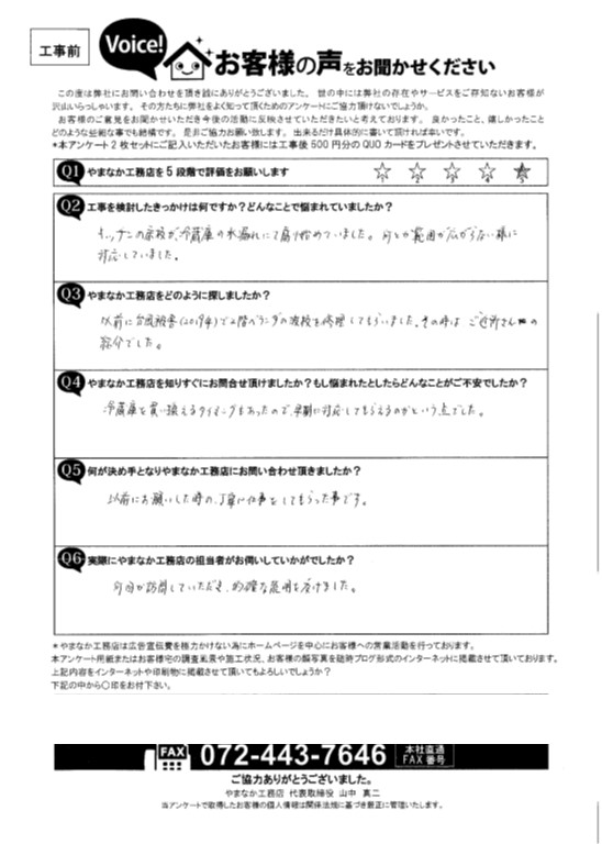 - 早期に対応してもらって助かりました。又、工事後に冷蔵庫にまだ水漏れがあるのに気付いてもらって養生板を敷いてもらったのは有難かったです。翌日の冷蔵庫の入替まで、床が濡れずにすみました。