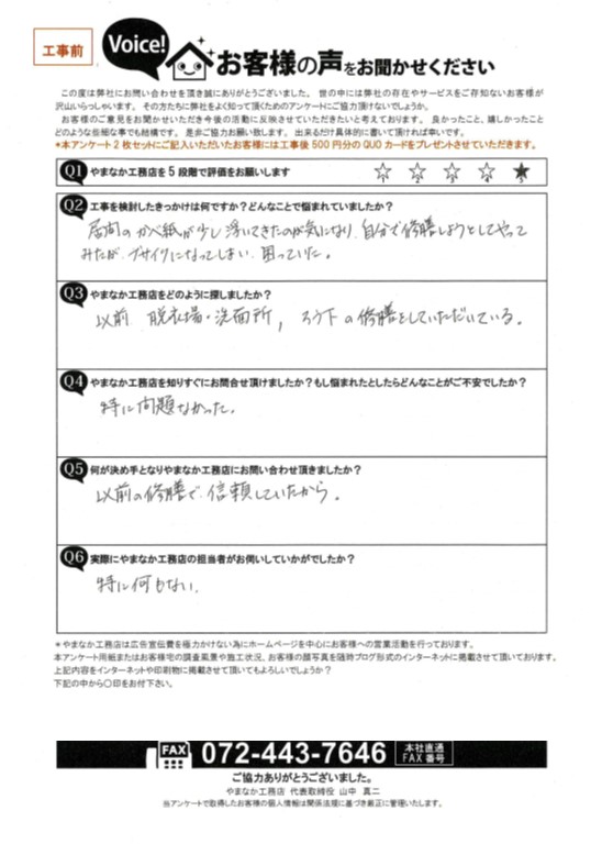 - 以前、脱衣所・洗面所・廊下の修繕をしていただいている。