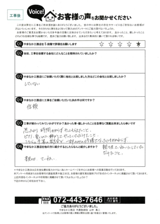 こちらの予算の都合で、一部のみの修繕になったにもかかわらず、親切丁寧にしていただけたこと。