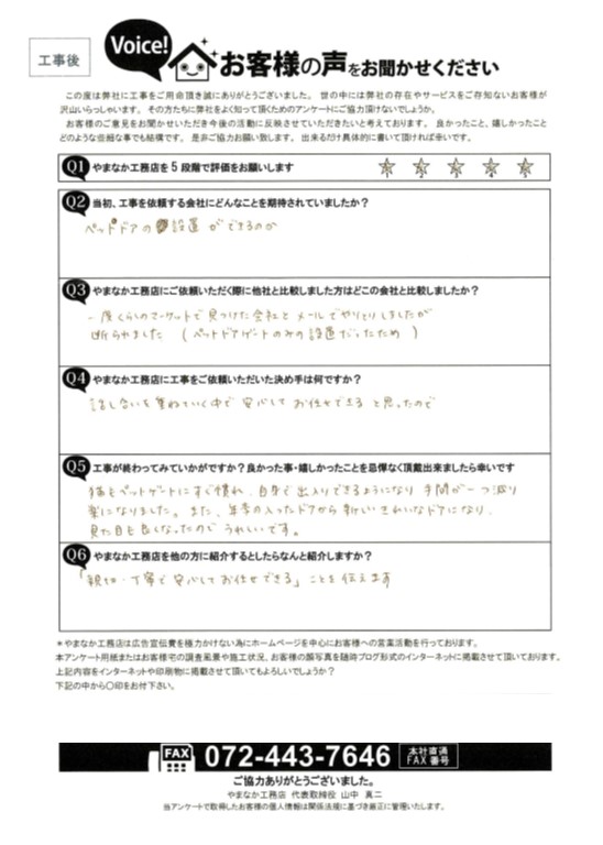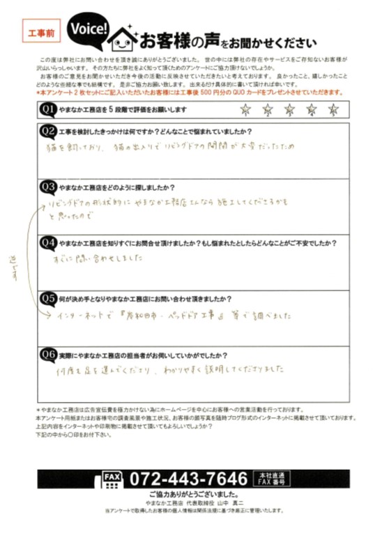 岸和田市にてリビングの片開きドアをペットドアに交換したY様の声