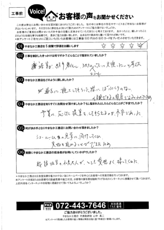 - 過去に施工してもらった際に、ぼったくりのない信頼できる工務店であるとわかったため。