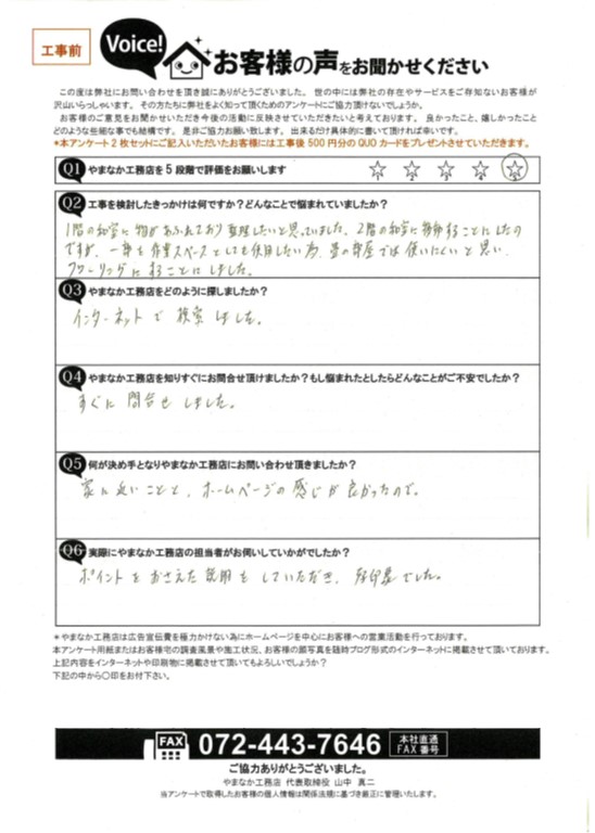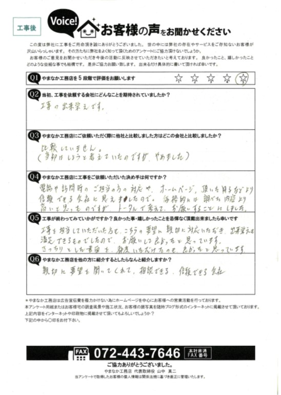 - 工事を担当していただいた方も、こちらの要望に親切に対応いただき、出来栄えも満足できるものでしたので、お願いして良かったと思っています。