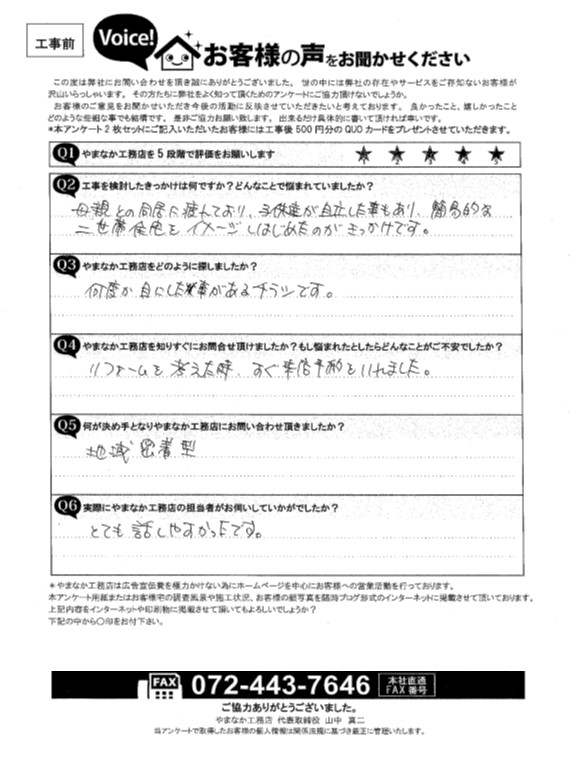 忠岡町にて2階にキッチンとトイレを増やし二世帯住宅にしたI様の声